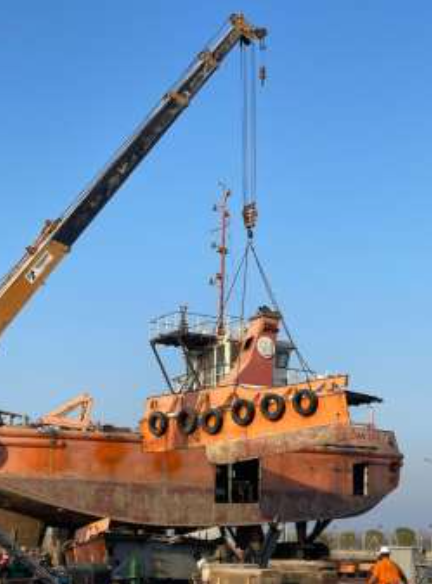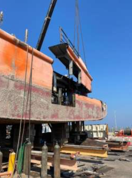 Cutting torches and heavy machinery are used to cut large pieces of steel.